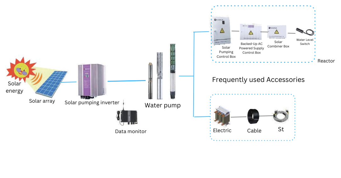 Solar pumping system consists of a solar pumping inverter, a data monitor fro remote monitoring & control (optional), a pump and a solar
